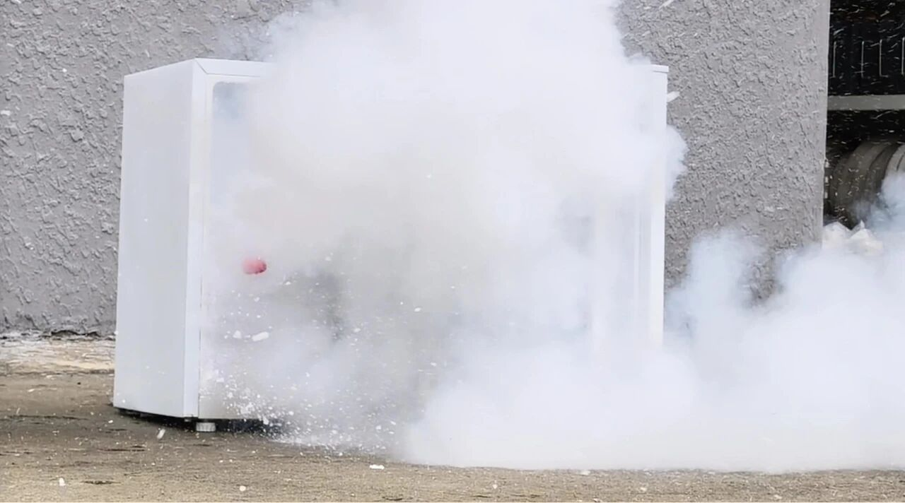 救火员继续试验,却没想到把冰箱给炸了。